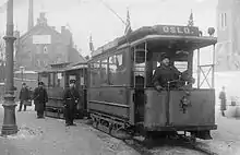The second class consisted of fourteen units delivered by Skabo between 1887 and 1892. These were delivered in various configurations of open and closed seating and were normally only operated during winter. They had the same dimensions as the Stephenson cars.[1] The final class, built by Falkenried, consisted of fifteen units delivered in 1897. Measuring 6.6 meters (22 ft) in length, they were sufficiently heavy they needed to be hauled by two horses. This was a calculated choice, as they were primarily intended to be used as trailers for the electric trams.[6]