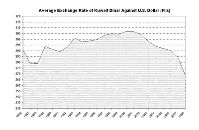 From 18 March 1975 to 4 January 2003, the dinar was pegged to a weighted currency basket. From 5 January 2003 until 20 May 2007, the pegging was switched to US$1 = KD 0.29963 with margins of ±3.5%.[11] The central rate translates to approximately KD 1 = US$3.53.