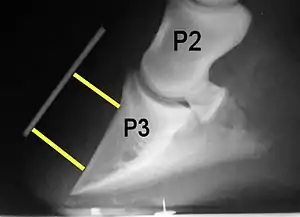 - Horn:lamellar distance (HL): the measurement from the most superficial aspect of the dorsal hoof wall to the face of P3. 2 distances are compared: a proximal measurement made just distal to the extensor process of P3, and a distal measurement made toward the tip of P3. These two values should be similar. In cases of rotation, the distal measurement will be higher than the proximal. In cases of distal displacement, both values will increase, but may remain equal. Therefore, it is ideal to have baseline radiographs for horses, especially for those at high-risk for laminitis, to compare to should laminitis ever be suspected. Normal HL values vary by breed and age:[1]