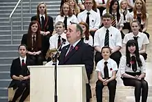 In 2009 it was announced that a new Lasswade High School Community Campus was to be built, with construction beginning in October 2011 on the site of the old school's playing fields. The school re-opened in 2013 as the Lasswade Centre, with ceremonial duties performed by the then First Minister of Scotland, Alex Salmond.[1] The new building cost £38 million to complete, and contains 90 classrooms to accommodate around 1,500 pupils.[1] The facility also has a purpose-built Sports Centre, which comprises a games hall, squash courts, fitness training rooms, activity movement studio, cafeteria, creche and spacious playing fields.