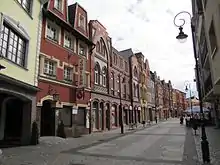 After the outbreak of World War II, the persecution of indigenous Poles, including Kashubians, intensified, and the patients of the local psychiatric hospital were murdered in Piaśnica, however, the Polish resistance movement remained present in the district.[17] In 1942, the Germans founded a subcamp of the Stutthof concentration camp and sent prisoners from the Buchenwald concentration camp there.[18] Further prisoners were sent from the main Stutthof camp, and the subcamp was dissolved only in February 1945, during the German-organized evacuation of the Stutthof main camp.[18] The Germans also operated a forced labour subcamp of the Stalag II-B prisoner-of-war camp for Allied POWs in the town.[19] The town was occupied without resistance by the Soviet Red Army on 10 March 1945. Most of the Old Town burned in the subsequent Soviet rampage, although the Gothic Church of St. James and the Teutonic castle survived.[13] During this time about 600 people committed suicide.[20]