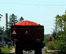 Tomatoes being transported in Leamington. The smoke stack of the former Heinz processing factory can be seen in the distance on the left.