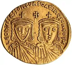 Leo IV was born on 25 January 750 AD,[2] to Emperor Constantine V and his first wife, Empress Tzitzak.[3] Because his mother was a Khazar, Leo was given the epithet 'the Khazar'.[4] Leo was elevated to co-emperor in 751, while still an infant.[3] He became emperor on 14 September 775, after Constantine V died while campaigning against the Bulgarian Empire.[5][6]
