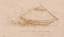 The concept was designed while Leonardo da Vinci was under the patronage of Ludovico Sforza in 1487.[2] Sometimes described as a prototype of modern tanks, Leonardo's armored vehicle represented a conical cover inspired by a turtle's shell. The covering was to be made of wood and reinforced with metal plates. Slanting angles would deflect enemy fire, similar to Sloped armour today. The machine was powered by two large cranks operated internally by four strong men. The vehicle was equipped with an array of light cannons, placed around the perimeter.[3]