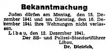 As a naval base, Liepāja came under the command of the German navy, the Kriegsmarine. Lieutenant commander (Korvettenkapitan) Stein was appointed as town commandant.[2] On July 1, 1941, Stein ordered that ten hostages be shot for every act of sabotage, and further put civilians in the target zone by declaring that Red Army soldiers were hiding among them in civilian attire.[2] This was the first announcement in Latvia of a threat to shoot hostages.[2] On July 5, 1941 Korvettenkapitan Brückner, who had taken over for Stein[2] issued a set of anti-Jewish regulations.[13] These were published in a local newspaper, Kurzemes Vārds.[12] Summarized these were as follows:[14]