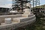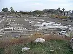 18.5 m × 35 m (61 ft × 115 ft) Ionic temple,[49] architect: Hermogenes of Priene, was peripteral hexastyle with 11 columns at the sides. The columns were set on plinths and there was a frieze of Dyonisiac scenes.[54]