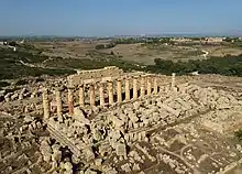 Doric peripteral hexastyle temple with 15 columns at each side with two inner chambers on a crepidoma of 3 steps. It was like the Temple of Hera at Olympia, but built entirely of stone.[8] The columns were monolithic with seven of the original 38 surviving. The broad capitals were carved as separate pieces and coated with marble stucco.[9]