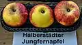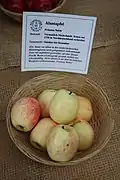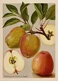 Astillisch[5] Germany Raised 1929 Parentage Red Astrachan x Signe Tillisch. Width 63–70 mm, height 56 mm. Flesh yellowish-white, juicy, soft, subacid. Eating Pick August. Use August.