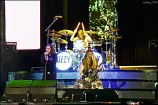For the first leg of the Speak of the Devil Tour in December 1982, Osbourne and his band performed with UFO bassist Pete Way.[16] After Gillis left to return to Night Ranger, the position of guitarist was filled at the end of the year by Jake E. Lee, formerly of Ratt and Rough Cutt.[17] George Lynch, who had previously auditioned for the band in 1979, was initially given the role by Osbourne, but was then immediately fired when Lee was brought in.[18] Don Costa took over from Way for the remainder of the tour,[19] before Bob Daisley returned in time to perform at the US Festival in May.[20] After the recording of Bark at the Moon, Tommy Aldridge was replaced by Carmine Appice, although by early 1984 he had returned due to personal differences and tensions between Osbourne and the new drummer.[21] By the time the Bark at the Moon Tour had finished in January 1985, Aldridge had decided to leave the band again, having not fully enjoyed the role since Rhoads's death.[22]