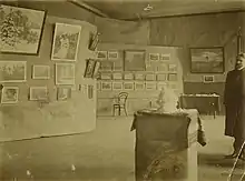 The exhibition was organized in the home of Petras Vileišis, the Vileišis Palace in Antakalnis suburb. The entire second floor (six rooms) were rented for 400 rubles.[5] The collected exhibits were selected and organized by Mikalojus Konstantinas Čiurlionis, Antanas Žmuidzinavičius, Petras Rimša. The exhibition catalog was printed in Lithuanian, Polish, and Russian.[2] The opening ceremony took place on 9 January 1907 [O.S. 27 December 1906].[6] It was attended by various officials and guests, including a representative of the General Governor of Vilnius, Governor of Vilnius Dmitry Lyubimov, and Bishop Eduard von der Ropp.[7] The ceremony was held in Lithuanian language with only brief translations to Russian to accommodate foreign guests.[8] The Polish press criticized the event because it did not use Polish.[9] The ceremony included a speech by Basanavičius and performances by Kanklės of Vilnius choir directed by Juozas Tallat-Kelpša.[2] Two days after the opening, Basanavičius withdrew from the organizational committee as he disagreed with the decision to invite Bishop von der Ropp.[9]