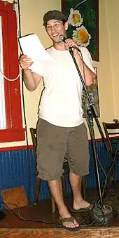 Owner Chris Howdyshell serving as master of ceremonies for open mic, in 2008