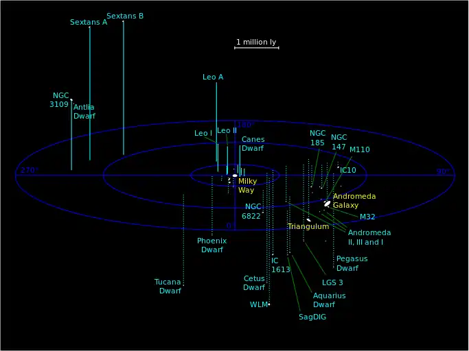 The membership of NGC 3109, with its companions Sextans A and the Antlia Dwarf Galaxy, is uncertain due to extreme distances from the center of the Local Group.[3] The other members of the group are likely gravitationally secluded from these large subgroups: IC 10, IC 1613, Phoenix Dwarf Galaxy, Leo A, Tucana Dwarf Galaxy, Cetus Dwarf Galaxy, Pegasus Dwarf Irregular Galaxy, Wolf–Lundmark–Melotte, Aquarius Dwarf Galaxy, and Sagittarius Dwarf Irregular Galaxy.[9]