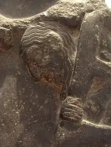 Prisoners escorted by a soldier, on a victory stele of Sargon of Akkad, circa 2300 BCE.[23] The hairstyle of the prisoners (curly hair on top and short hair on the sides) is characteristic of Sumerians, as also seen on the Standard of Ur.[24] Louvre Museum.