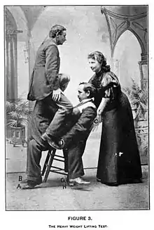 ![]() Lulu Hurst demonstrates her technique of overpowering three men on a chair | |