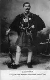 To strengthen Greek efforts for Macedonia, the Hellenic Macedonian Committee was formed in 1903, under the leadership of Dimitrios Kalapothakis; its members included Ion Dragoumis and Pavlos Melas.[39] Its fighters were known as Makedonomachoi ("Macedonian fighters").[40] Greece helped the Macedonians to resist both Ottoman and Bulgarian forces, by sending military officers who formed bands made up of Macedonians and other Greek volunteers, something that resulted in the Macedonian Struggle from 1904 to 1908, which ended with the Young Turk Revolution.[41][42] The Macedonians fought alongside the regular Greek army during the struggle for Macedonia. There are monuments in Macedonia commemorating the Makedonomachoi, the local Macedonian and other Greek fighters, who took part in the wars and died to liberate Macedonia from the Ottoman rule, officially memorialized as heroes.[43][44]