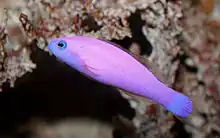 | Orangehead anthias | Pseudanthias heemstrai | Yes | Pink underside with orange back and mask, dark red splotch on caudal fin, along with iridescent blue anal and pelvic fins. | 13 cm (5.1 in) | |