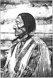Mato-tope holding a lance and wearing painted and quilled shirt: aquatint by Karl Bodmer from the book "Maximilian, Prince of Wied’s Travels in the Interior of North America, during the years 1832–1834". The shirt is made of "bighorn leather".[1]