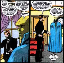 A later retcon changed his controller to the villainous computer program Kilg%re (pronounced Kilgore[6]), which had taken over Metron's machine. A much later retcon mitigated the Kilg%re's and Metron's influence, stating that Lord already had plans for taking over the League with his company Maxwell Lord Enterprises, and that he would have pursued them regardless.[4]