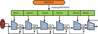 In the diagram, the one-way compression function is denoted by f, and transforms two fixed length inputs to an output of the same size as one of the inputs. The algorithm starts with an initial value, the initialization vector (IV). The IV is a fixed value (algorithm or implementation specific). For each message block, the compression (or compacting) function f takes the result so far, combines it with the message block, and produces an intermediate result. The last block is padded with zeros as needed and bits representing the length of the entire message are appended. (See below for a detailed length padding example.)