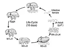 Loss of reproductive capabilities through Metaparasitylenchus hypothenemi parasitization is tied to the lifecycle of the nematode. Mature parasitic females are carried through the beetle’s lifecycle. During this time, eggs hatch within the female and proceed through to stage J3 (see Lifecycle) and at this point are ready to exit the host beetle. Exit occurs through the GI tract or the reproductive tract and expulsion involves arrest of the beetle’s own reproductive capabilities.[2]