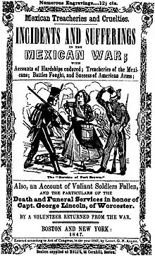 Although Polk hoped to avoid a protracted war over Texas, the extended conflict stretched regular army resources, necessitating the recruitment of volunteers with short-term enlistments. Some enlistments were for a year, but others were for 3 or 6 months.[63] The best volunteers signed up for a year's service in the summer of 1846, with their enlistments expiring just when General Winfield Scott's campaign was poised to capture Mexico City. Many did not re-enlist, deciding that they would rather return home than place themselves in harm's way of disease, threat of death or injury on the battlefield, or in guerrilla warfare. Their patriotism was doubted by some in the U.S., but they were not counted as deserters.[64] The volunteers were far less disciplined than the regular army, with many committing attacks on the civilian population, sometimes stemming from anti-Catholic and anti-Mexican racial bias.[65] Soldiers' memoirs describe cases of looting and murder of Mexican civilians, mostly by volunteers. One officer's diary records: "We reached Burrita about 5 pm, many of the Louisiana volunteers were there, a lawless drunken rabble. They had driven away the inhabitants, taken possession of their houses, and were emulating each other in making beasts of themselves."[66] John L. O'Sullivan, a vocal proponent of Manifest Destiny, later recalled "The regulars regarded the volunteers with importance and contempt ... [The volunteers] robbed Mexicans of their cattle and corn, stole their fences for firewood, got drunk, and killed several inoffensive inhabitants of the town in the streets." Many of the volunteers were unwanted and considered poor soldiers. The expression "Just like Gaines's army" came to refer to something useless, the phrase having originated when a group of untrained and unwilling Louisiana troops was rejected and sent back by General Taylor at the beginning of the war.[67]
