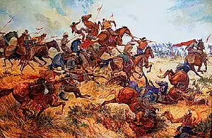 Indigenous populations in Mexico played a crucial role in the defending their land. By the beginning of the war, indigenous populations were depleted of their natural resources due to an influx of American settlers. As a result, indigenous populations from the Great Plains region had to rely on raiding American camps in order to survive.[51] Although raiding was much more lucrative than hunting, indigenous population did not have much of a choice. Indigenous soldiers who volunteered to fight with the Mexican Army were often abandoned and compensated unfairly.[51] By raiding, indigenous populations were also able to acquire horses and properly tame them to move efficiently during battles.[52] Captive-taking methods, especially that of the Comanche tribe, were also used to the advantage of the Mexican Army as captives would end up assisting indigenous populations in the raids of American forces.[53]