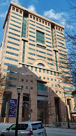 Graves designed some of his most iconic buildings in the early 1980s, including the Portland Building.[10] The fifteen-story Portland Municipal Services Building, his first major public commission, opened in 1982 in downtown Portland, Oregon.[27] The "monolithic cube" with decorated facades and colorful, oversized columns is "considered a seminal Postmodern work"[28] and one of Graves's best-known works of architecture. The celebrated but controversial municipal office also became an icon for the city of Portland and subject to an ongoing preservation debate.[27][5] Regarded as the first major built example of postmodern architecture in a tall office building, the Portland Building was added to the National Register of Historic Places in 2011.[29] Although it faced demolition in 2014, the city government decided to proceed with a renovation, estimated to cost $195 million.[27][5]