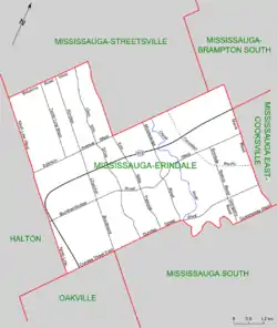It consisted of the part of the City of Mississauga bounded by a line drawn from the southwestern city limit northeast along Britannia Road West, southeast along Erin Mills Parkway, northeast along Eglinton Avenue West, southeast along Mavis Road, southwest along the Queensway West, west along the Credit River and southwest along Dundas Street West to the city limit.