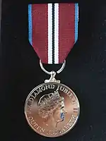 In Jamaica, the Sovereign's jubilee is celebrated by awarding commemorative medals to members of the Jamaican frontline services. Special Jubilee medals were awarded in 2012 for the Queen's Diamond Jubilee, and in 2022 for the Queen's Platinum Jubilee.[72][73]