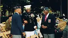 Reuben J. McNair Sr., and a fellow veteran of the Montford Point Marine Association, converses with a present-day African American Marine officer.