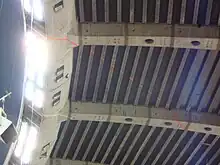 In 1999, a 350 m2 (3,770 sq ft) portion of the roof collapsed on January 18, dumping ice and snow on workers that were setting up for the annual Montreal Auto Show.[21][26] The auto show and a boat show the following month were cancelled,[27] and the auto show left the venue for good (since then, the Montreal Auto Show has usually been held at the Palais des congrès de Montréal). Repaired once again, the roof was modified to better withstand winter conditions: the OIB installed a network of pipes to circulate heated water under the roof to allow for snow melting. Despite these corrective measures, the stadium floor remained closed from December to March.[28] Birdair, the fabric provider and designer of the roof, was later sued for the roof failure.[29] The installer of the roof, Danny's Construction, having suffered tremendous cost overruns along with its subcontractor Montacier, due to changes in the plans and specifications and delays, was terminated during the construction, and Birdair completed the project. Danny's Construction sued Birdair in 1999.[30] In February 2010, after a lengthy trial, the Quebec Superior Court awarded a judgement in favour of Danny's Construction and dismissed Birdair's countersuit.[31]