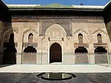 The Marinids, who chose Fes as their capital, were also the first to build madrasas in this region, a type of institution which originated in Iran and had spread west.[1] The madrasas of Fes, such as the Bou Inania, al-Attarine, and as-Sahrij madrasas, as well as the Marinid madrasa of Salé and the other Bou Inania in Meknes, are considered among the greatest architectural works of this period.[67][65][1] The Marinids also imitated previous dynasties by founding their own fortified palace-city to the west of Fes, known afterwards as Fes el-Jdid ("New Fez"), which remained a frequent center of power in Morocco even during later dynasties such as the 'Alawis.[36][68] Unlike the Alhambra of Granada, the grand palaces of Fes el-Jdid have not survived, though they may been comparable in splendor.[69] The Great Mosque of Fes el-Jdid, on the other hand, is one of the major Marinid mosques that is still well-preserved today, while numerous other mosques were built throughout Fes and in other cities during this period, including the Lalla az-Zhar Mosque in Fes, the Ben Salah Mosque in Marrakesh, the Zawiya an-Nussak in Salé, the Great Mosque of Oujda, and others.[1]