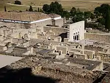 The collapse of the Cordoban caliphate in the early 11th century gave rise to the first Taifas period, during which al-Andalus was politically fragmented into a number of smaller kingdoms. The disintegration of central authority resulted in the ruin and pillage of Madinat al-Zahra.[42] Despite this political decline, the culture of the Taifa emirates was vibrant and productive, with the architectural forms of the Caliphate period continuing to evolve. A number of important palaces or fortresses, in various cities, were begun or expanded by local dynasties. The Alcazaba of Malaga, begun in the early 11th century and subsequently modified, is one of the most important examples. The earliest part of the palace features horseshoe arches with carved vegetal decoration that appear to imitate, with less sophistication, the style of Madinat al-Zahra. Another part contains intersecting multifoil arches that resemble those of al-Hakam II's maqsura in the Cordoba mosque, though serving a purely decorative and non-structural purpose here.[13]: 154 [24]: 53–55 The Alcazar of Seville and the Alcazaba of the Alhambra were also the site of earlier fortresses or palaces by the Abbadids (in Seville) and the Zirids (in Granada), respectively.[6]: 127 The Alcazaba of Almería, along with a preserved section of Almería's defensive walls, dates from the 11th century, though little remains of the palaces built inside the Alcazaba.[6]: 124 The Bañuelo of Granada, another historic Islamic bathhouse, is also traditionally dated to the 11th century, though recent studies suggest it may date from slightly later, the 12th century.[43][44]