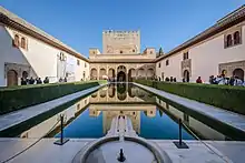 The most famous architectural legacy of the Nasrids in Granada is the Alhambra, a hilltop palace district protected by heavy fortifications and containing some of the most famous and best-preserved palaces of western Islamic architecture. Initially a fortress built by the Zirids in the 11th century (corresponding to the current Alcazaba), it was expanded into a self-contained and well-fortified palace district complete with habitations for servants and workers. The oldest remaining palace there today, built under Muhammad III (ruled 1302–1309), is the Palacio del Partal which, although only partly preserved, demonstrates the typical layout which would be repeated in other palaces nearby: a courtyard centered on a large reflective pool with porticos at either end and a mirador (lookout) tower at one end which looked down on the city from the edge of the palace walls.[70][24][6] The most famous palaces, the Comares Palace and the Palace of the Lions, were added afterwards. The Comares Palace, which includes a lavish hammam (bathhouse) and the Hall of the Ambasadors (a throne room), was begun under Isma'il I (ruled 1314–1325) but mostly constructed under Yusuf I (1333–1354) and Muhammad V (ruled 1354–1359 and 1362–1391).[24][2]: 152 The Palace of the Lions was built under Muhammad V and possibly finished around 1380.[2]: 152 [24]: 142 It features a courtyard with a central marble fountain decorated with twelve lion sculptures. The galleries and chambers around the courtyard are notable for their extremely fine stucco decoration and some exceptional muqarnas vault ceilings.[2]: 160–163 Four other nearby palaces in the Alhambra were demolished at various points after the end of the Reconquista (1492).[24] The summer palace and gardens known as the Generalife were also created nearby – at the end of the 13th century[2]: 164 or in the early 14th century[6]: 204 – in a tradition reminiscent of the Almohad-era Agdal Gardens of Marrakesh and the Marinid Royal Gardens of Fes.[68] The Nasrids also built other structures throughout the city – such as the Madrasa and the Corral del Carbón – and left their mark on other structures and fortifications throughout their territory, though not many significant structures have survived intact to the present-day.[6]