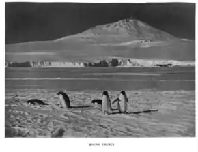 Photograph of Mount Erebus (and Adélie penguins) taken by the Terra Nova expedition in 1913