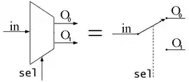 Schematic of a 1-to-2 demultiplexer. Like a multiplexer, it can be equated to a controlled switch.