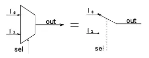 An electronic multiplexer can be considered as a multiple-input, single-output switch, and a demultiplexer as a single-input, multiple-output switch.[3] The schematic symbol for a multiplexer is an isosceles trapezoid with the longer parallel side containing the input pins and the short parallel side containing the output pin.[4] The schematic on the right shows a 2-to-1 multiplexer on the left and an equivalent switch on the right. The wire connects the desired input to the output.