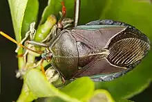 Musgraveia sulciventris is a large stink bug found in Australia, sometimes known as the bronze orange bug. It is considered a pest, particularly to plants in the citrus group.[1] Bronze orange bugs suck the sap from trees, which causes the flowers and fruit to fall.[2][3]