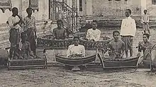 One of the traditional music forms is Pinpeat (Khmer: ពិណពាទ្យ), in which an orchestra or musical ensemble performs the ceremonial music of the royal courts and temples of Cambodia. The royal orchestra would accompany the classical ballets, both male (Lokhon Khol) and female (Apsara), as well as the Grand Theater of Shadows, the Sbek Thom.[5] The orchestra consists of approximately nine or ten instruments, mainly wind and percussion (including several varieties of xylophone and drums). It accompanies court dances, masked plays, shadow plays, and religious ceremonies. The pinpeat is analogous to the piphat ensemble of Thailand.[6]