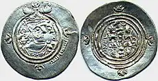 The rāshidūn caliphs used symbols of the Sasanian Empire (crescent-star, fire temple, depictions of the last Sasanian emperor Khosrow II) by adding the Arabic expression bismillāh on their coins, instead of designing new ones.[75]
