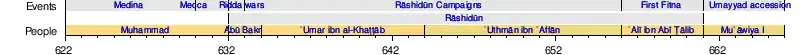 After the death of Muhammad in 632 CE, his community needed to appoint a new leader, giving rise to the title of caliph (Arabic: خَليفة, romanized: khalīfa, lit.'successor').[4][8][16] Thus, the subsequent Islamic empires were known as "caliphates",[4][8][68] and a series of four caliphs governed the early Islamic empire: Abū Bakr (632–634), ʿUmar ibn al-Khaṭṭāb (Umar І, 634–644), ʿUthmān ibn ʿAffān (644–656), and ʿAlī ibn Abī Ṭālib (656–661). These leaders are known as the rāshidūn ("rightly-guided") caliphs in Sunnī Islam.[8] They oversaw the initial phase of the early Muslim conquests, advancing through Persia, the Levant, Egypt, and North Africa.[8]
