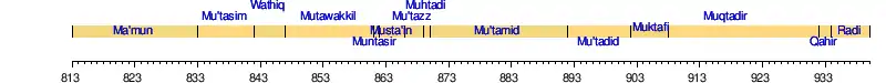 Ar-RadiAl-QahirAl-MuqtadirAl-MuktafiAl-Mu'tadidAl-Mu'tamidAl-MuhtadiAl-Mu'tazzAl-Musta'inAl-MuntasirAl-MutawakkilAl-WathiqAl-Mu'tasimAl-Ma'mun
