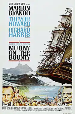 Mutiny on the Bounty is a 1962 American Technicolor epic historical drama film released by Metro-Goldwyn-Mayer, directed by Lewis Milestone and starring Marlon Brando, Trevor Howard, and Richard Harris. The screenplay was written by Charles Lederer (with uncredited input from Eric Ambler, William L. Driscoll, Borden Chase, John Gay, and Ben Hecht),[3] based on the novel Mutiny on the Bounty by Charles Nordhoff and James Norman Hall. Bronisław Kaper composed the score.