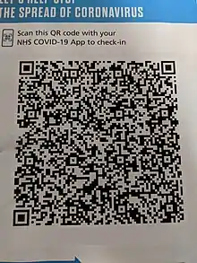 - ↑ "Which venues in England should display the official NHS QR code poster?". faq.covid19.nhs.uk. Retrieved 24 September 2020.