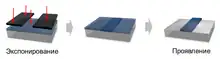 Photoresists can be classified as positive or negative. In positive photoresists, the photochemical reaction that occurs during exposure, weakens the polymer, making it more soluble to the developer so the positive pattern is achieved. Therefore, the masks contains an exact copy of the pattern, which is to remain on the wafer, as a stencil for subsequent processing. In the case of negative photoresists, exposure to light causes the polymerization of the photoresist so the negative resist remains on the surface of the substrate where it is exposed, and the developer solution removes only the unexposed areas. Masks used for negative photoresists contain the inverse or photographic “negative” of the pattern to be transferred. Both negative and positive photoresists have their own advantages. The advantages of negative photoresists are good adhesion to silicon, lower cost, and a shorter processing time. The advantages of positive photoresists are better resolution and thermal stability.[32]