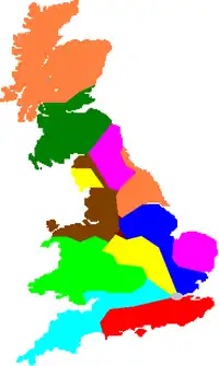 A map of England, Wales and Scotland showing the approximate boundaries of each NLC "zone", as described in the accompanying table.