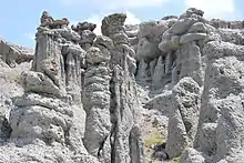 The stone town of Kuklica is an area consisting of over 120 naturally formed stone pillars, located in the village of Kuklica, near Kratovo in North Macedonia.[10] Kratovo, which lies on the slope of Mount Osogovo, is itself located in the basin of an extinct volcano and hosts the Plavica (or Plavitsa) deposit, which has been mined since Roman times.[11][12]