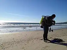 - Surf and beach entries: these are ofteen complicated by breaking waves. A small break is not usually a problem, but a wave with sufficient energy to knock a diver over is usually best avoided, or addressed by going under if it cannot be avoided. The safe limit differs from diver to diver, and it depends on the equipment used. Going under the break requires wearing the mask and fins while the diver breathes through the regulator. It is easier to wear fins while walking backward through a broken wave, and the type and height of the break can be important. A plunging breaker is much more difficult and dangerous than a spilling breaker for both entries and exits.