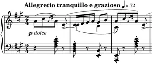 The Second, Third and Fourth piano sonatas are unrelated one-movement works. They were written during the period 1904–07 and published as the "Sonata-Triad", Op. 11. The first of the trio, in A♭, is an ecstatic work with attractive, lyrical themes, prefaced by a poem by Goethe.[14] The second, in D minor, is entitled "Sonate-Elegie". It opens slowly with one of Medtner's best-known themes and closes with an animated coda (Allegro molto doppio movimento, in D major) based on the second subject. The third, in C, returns to the lyricism of the first.