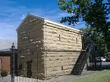 American county courthouses at the beginning of the nineteenth century were often a single story high, and centered around a single courtroom.[3] Access to the courtroom could be directly through the main exterior entrance, with no interior passageways. The courtroom could be adjoined to other rooms, such as clerk's offices and deliberation rooms for magistrates and jurors. As a county grew in population and more revenue was collected from taxes, an early log or frame courthouse might have been replaced with a more substantial brick structure. Some early courthouses were attached to the county jail, while other counties might have had a free standing jail with perhaps only two or three cells.